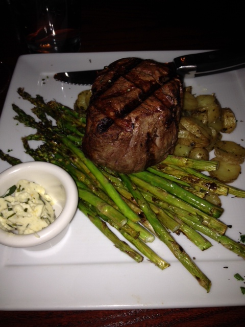 My main course was a delicate fillet mignon. Again, the menu describes, “Beautiful 2 inch thick filet topped with a slice of our homemade horseradish and lemon butter with roasted fingerling potatoes and grilled asparagus.”