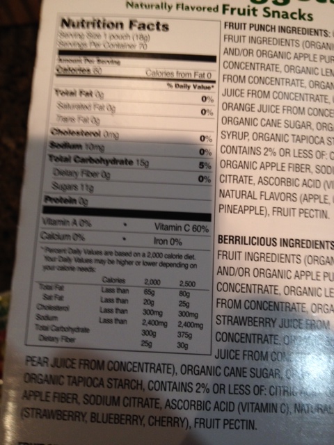 The snack I’m writing about here calls itself Florida’s natural organic fruit nuggets. They’re basically gummy type chewy things filled with sugar and little else of redeeming nutritional value. Calorie count is kept low by doling them out in tiny packets. I would normally eat two or three and still not feel any snacking hunger quenched. You can see the nutrition readout here, 11 grams of sugar per pouch.