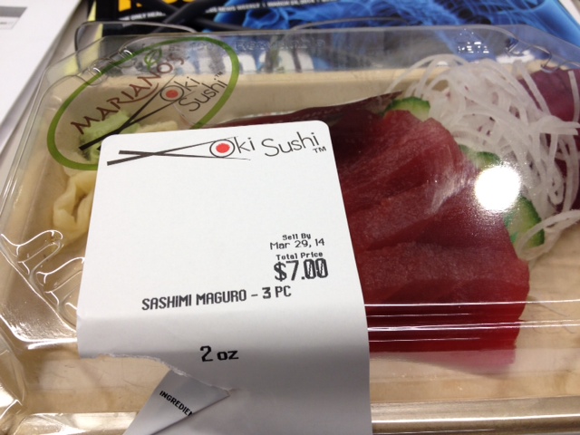 Looking at the Mariano’s sushi selection one day, however, I saw some sashimi tuna, slices of wonderful ahi tuna, and thought they would be a nice accompaniment for my usual salad. I bought this package for $7, getting two ounces of sashimi. You can do the math, that comes out to $56 a pound, not bad for the retailer.