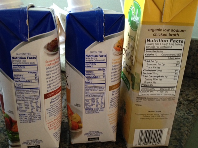 Low-sodium broth is relatively easy to find. You have to look harder to find sodium-free broth, but it is out there. But always check the nutrition labels for the real story. You may find some so-called no salt added broth has more sodium than one calling itself low-sodium. That was the case for me with the broths shown below.