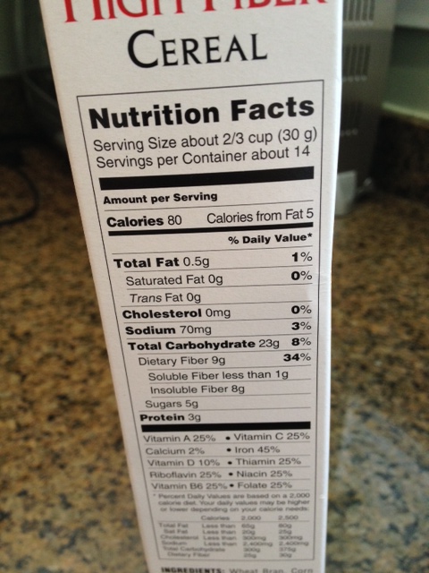 My go-to cereal has become Trader Joe’s High Fiber cereal. A serving, which is 2/3s of a cup, has only 80 calories, 0.5 grams of fat and 5 grams of sugar with only 70 mgs of salt. It also has 9 grams of fiber, more than most cereals that tout their fiber content. Up it to a cup and you’re at 12 grams of fiber.