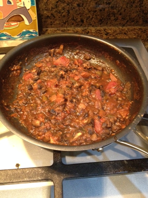 I whipped up a filling made with cut up portobello mushrooms, tomatoes and a low-salt roasted garlic-flavored salsa I bought at Trader Joe’s.