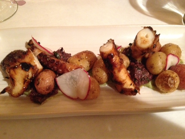I started with a dozen oysters, six East and six West Coast. A small chalk board on the table lists the varieties available each night. Each was fabulous, smooth and just dreamy, the way an oyster should taste.