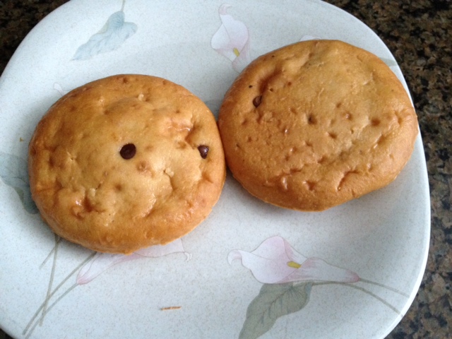 The tops come frozen, you heat them in a microwave so they’re warm when you eat them, a nice touch. Don’t expect the river of chocolate chips that the package art shows, however. It’s more like find the chocolate chip in these. Take a look at my photo of two on a plate and compare it to the package to see what I mean.