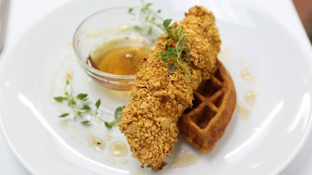 Chef Richard's re-imagined chicken and waffles. Not exactly gut-busting.