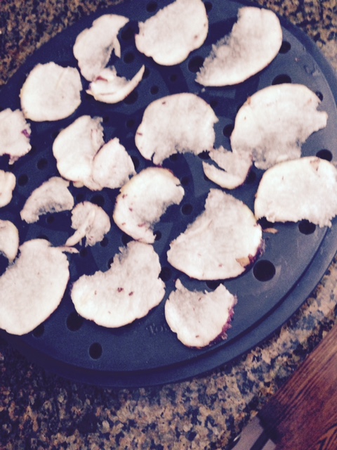 Potato chips are difficult to squeeze into a low-fat, low-salt diet, but I found a way to make my own with no salt and no fat thanks to a handy microwave device, Top Chips chip maker, that I bought last year. I’ve come to make them as a special treat from time to time, usually making one large russet potato into chips.