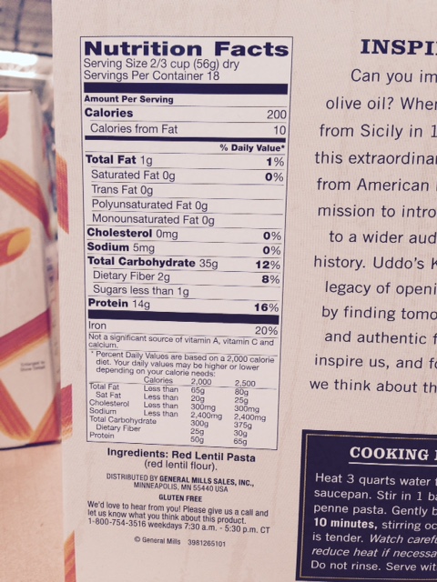 But while I was looking at it, another woman came by and complained about the amount of carbs in a serving, 35 grams. So if you’re avoiding carbs, this might not be the pasta for you.