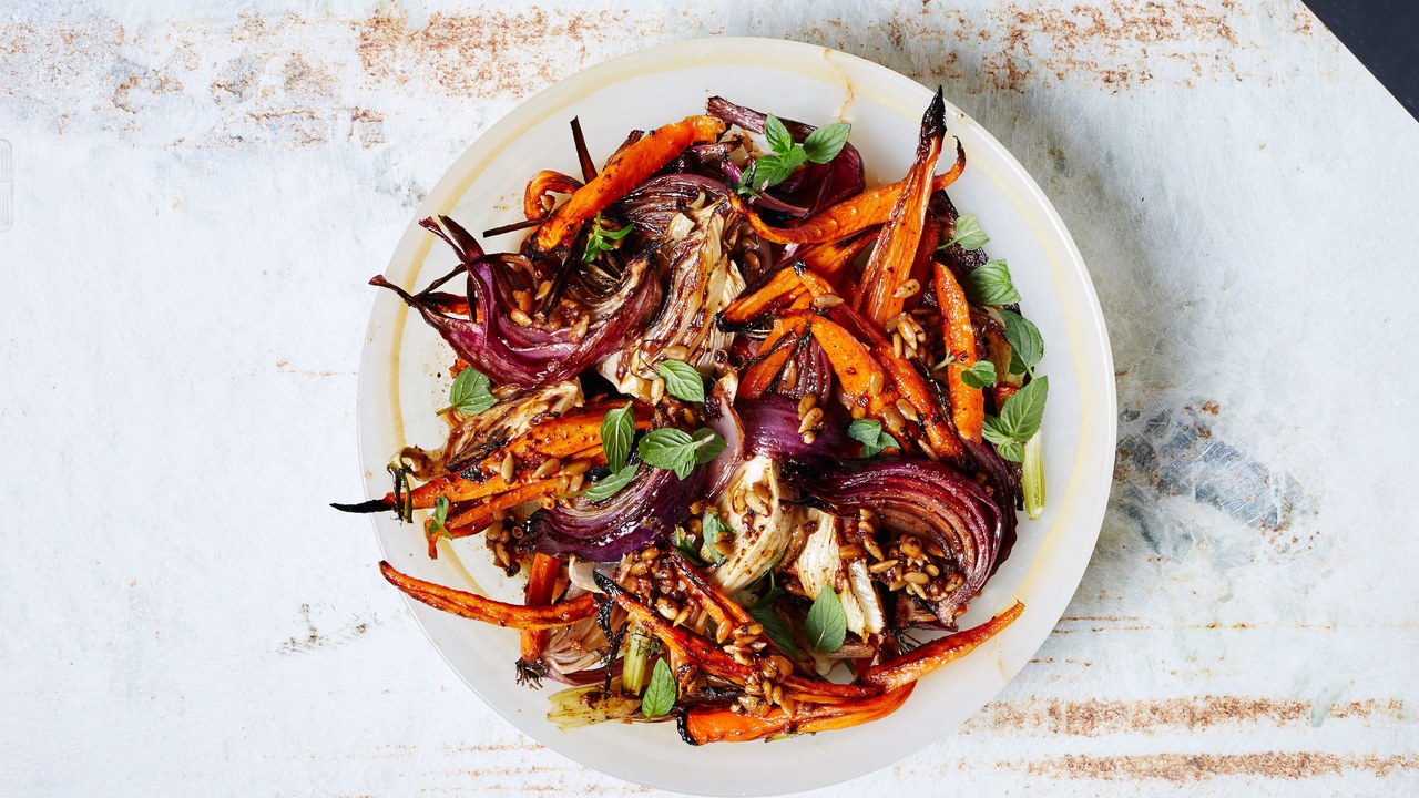 Combine roasted carrots, fennel, and onions onto the same baking sheet, drizzle vinaigrette over, and toss to coat well; transfer to a platter.