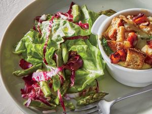 The trick to keep salads from getting boring for those of us who eat a lot of them is to mix up the variety of items to add to the basic lettuce. This salad, using bibb lettuce along with radicchio, and asparagus, popped up recently in a Cooking Light email I receive and I thought it sounded worth sharing.