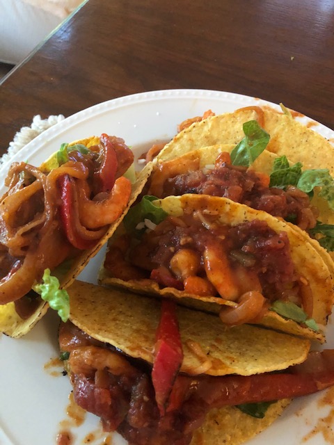 I normally make tacos with ground turkey to get a lean protein option. Recently, though, I used shrimp for a change pf pace. The shrimp I bought were precooked, so they jsut needed some warm in a frying pan with Mrs Dash taco spices mixed with water. I had first made some peppers and onions in the same pan to flavor it, eventually cooking everything together.