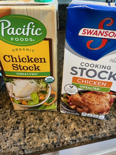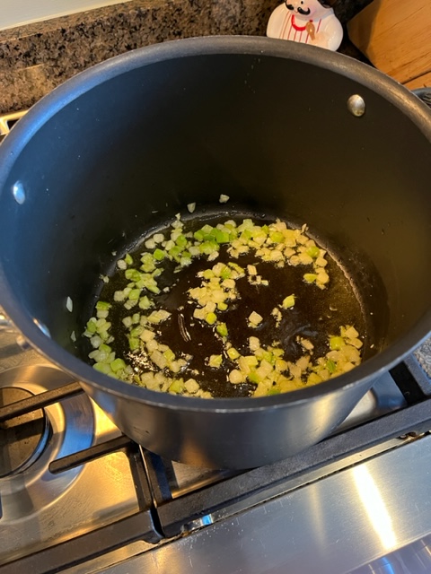 I had two boxes of low-sodium chicken broth (see photos here) in my fridge, having opened them to use for basting my turkey on Thanksgiving. What was left went into a soup pot after I had sauteed some celery and onion bits. I was lucky enough to get those already cut at a local supermarket that was selling big boxes of celery and onions for only a dollar after Thanksgiving. They were packaged for making stuffing.