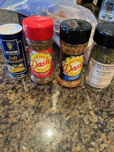 The stock went back into a big pot and I added turkey we had saved, along with more celery, onions and carrots. All the while, I was seasoning with Mrs. Dash salt-free seasoning and a mixture of salt-free spices (see my photos).