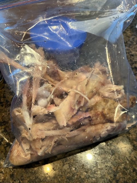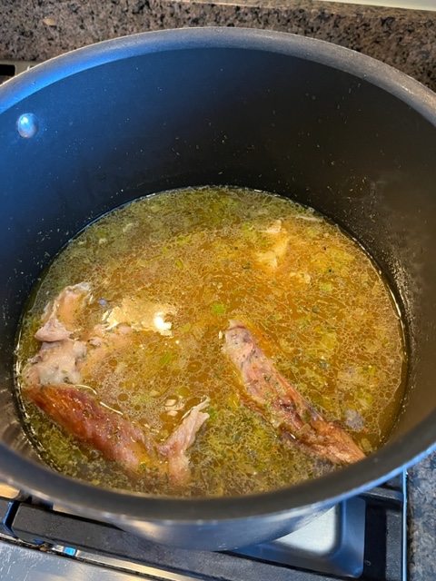 Next, I added water, about the same volume as the stock. And then came some carrots and all the bones and scraps I’d saved from the turkey. I boiled all that for about three hours to infuse it with the turkey flavor. I then passed it through strainer. This gave me me turkey stock.