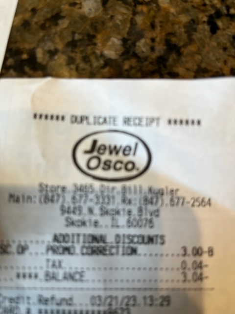 There was a time, under a different ownership, when Jewel would refund the full purchase price of an item you were mischarged for. Those days are gone, but I did get my $3 back.