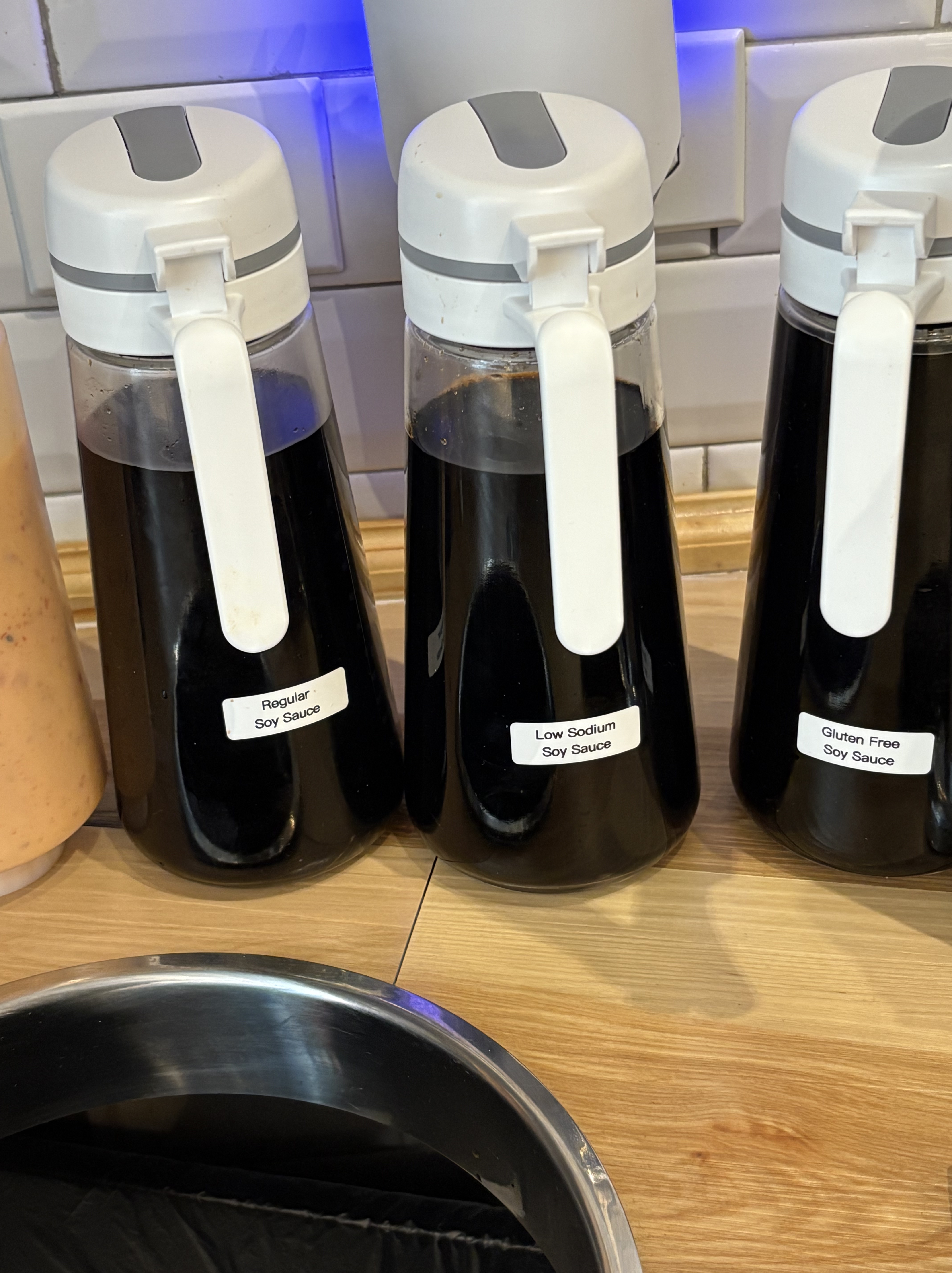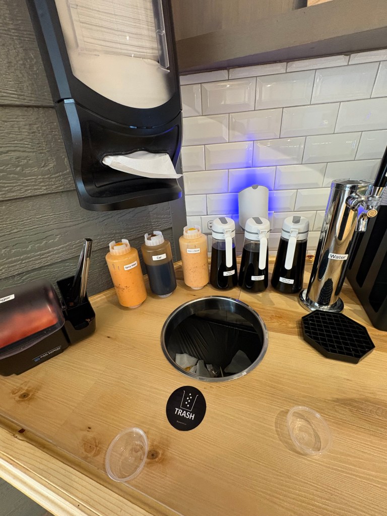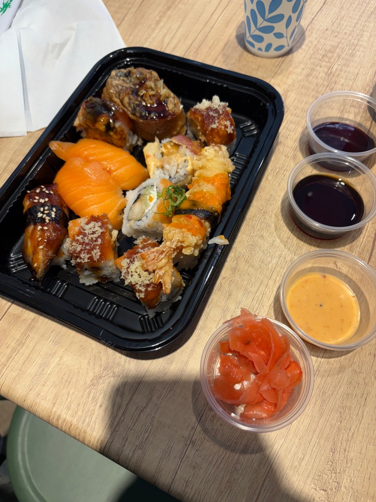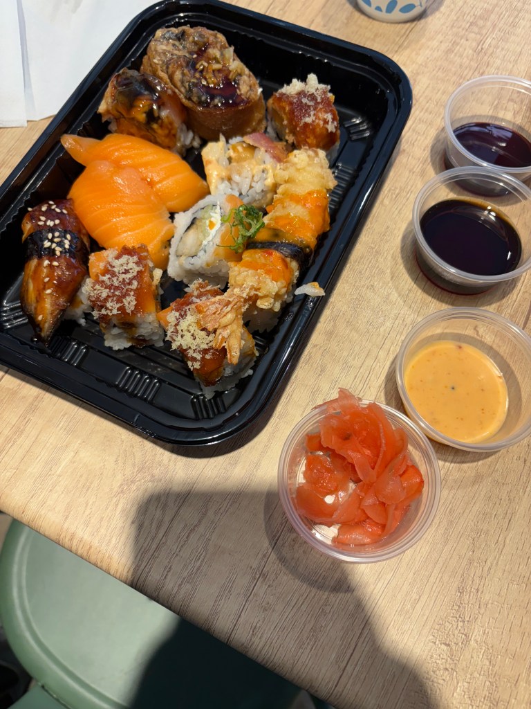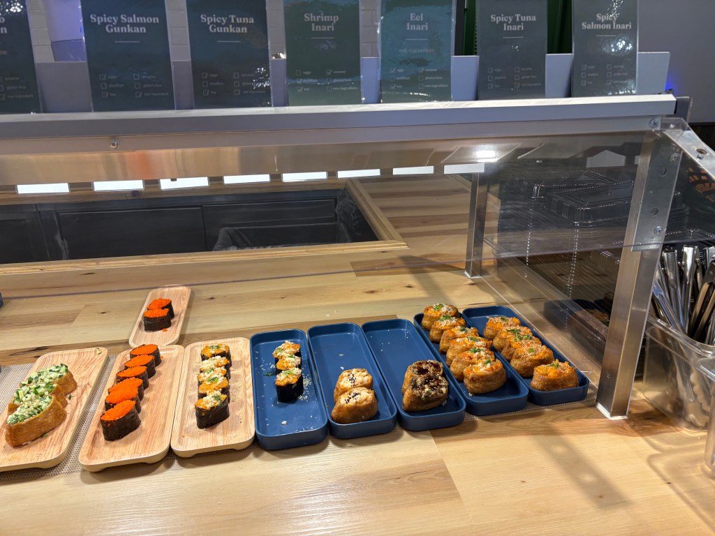 The variety of sauces available included low-sodium soy sauce, great if you’re watching salt intake. I also tried an eel sauce, very salty, and a house orange sauce of some type (labeled Grain & Secret) which was flavorful.