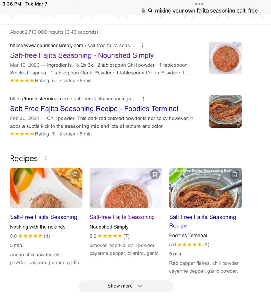 I did a search for “mixing your own fajita seasoning salt-free” and the results poured in.